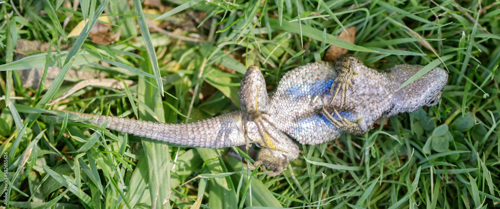 Western Fence Lizard playing dead. Defense tactic of an adult male, after got caught and turned loose. Santa Clara County, California, USA.
