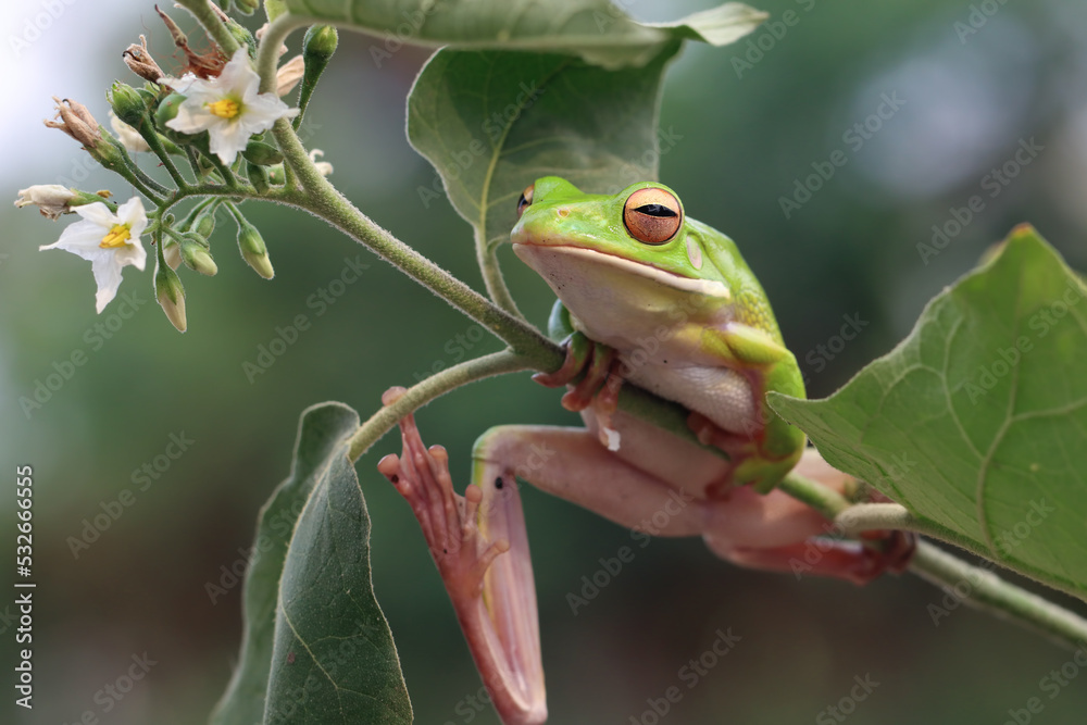 White-lipped tree frog (Litoria infrafrenata) on branch, white-lipped tree frog (Litoria infrafrenata) closeup on green leaves