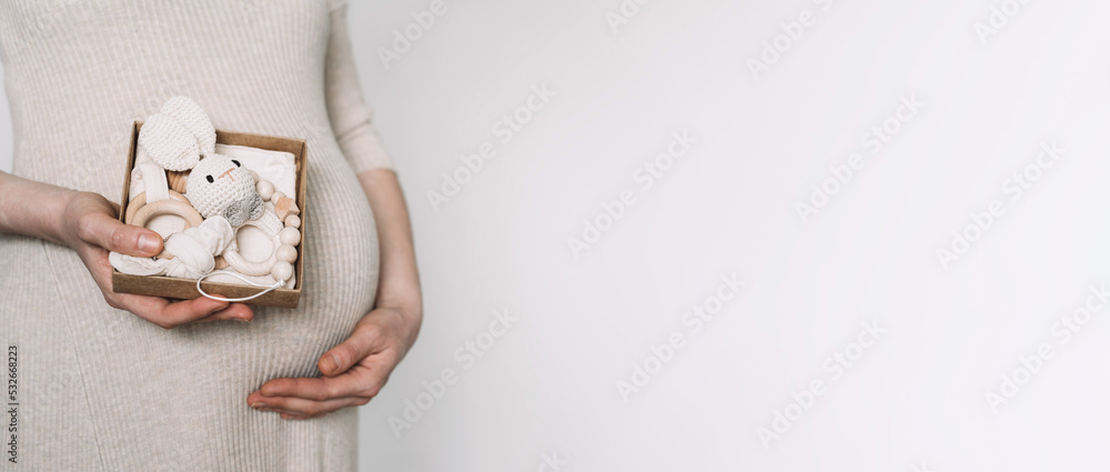 Pregnancy, maternity, preparation, baby expectation concept. Baby shower, infant care concept. Pregnant woman holding gift, wooden newborn stuff, baby accessories, teether, toys on beige background