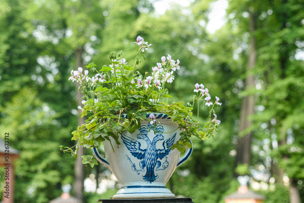 White flowers grow blooming in ancient decorative vase against blurry green trees in park. Sightseeing attracts visitors with blossom of plants