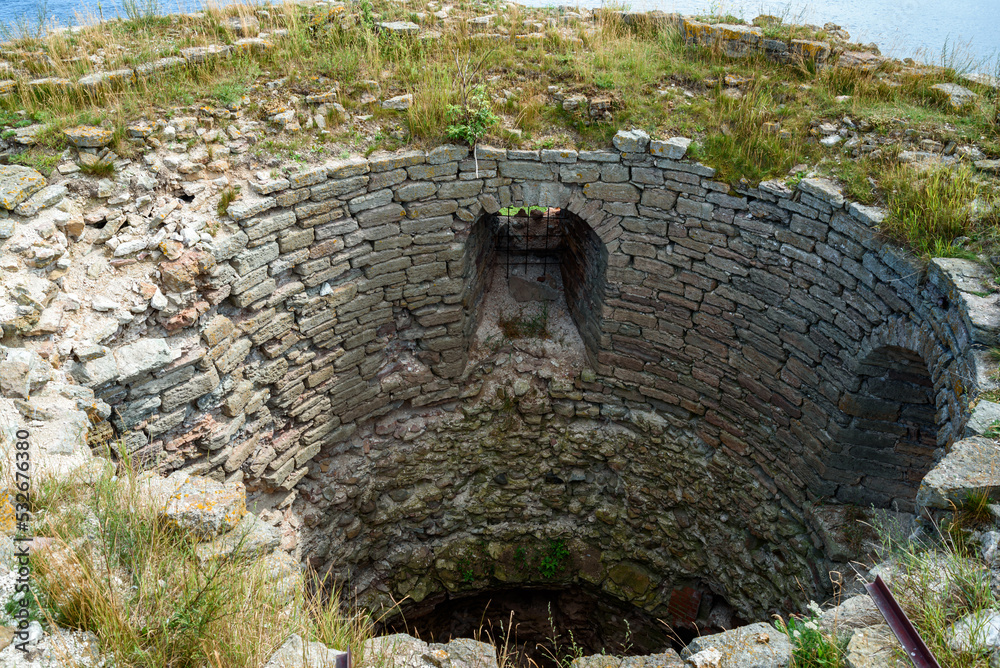 Historical fortress brick well descending into ground on sunny day. Old sightseeing overgrown with grass attracts tourist with texture