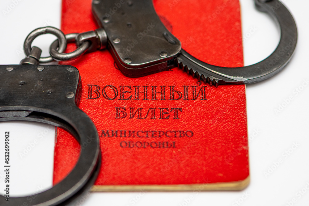 Russian military ticket has handcuffs on it, white background. Translation of the inscription: "Military ticket". Concept: mobilization into the army, criminal responsibility for desertion, evasion.