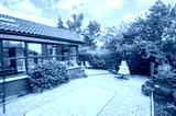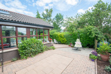 Patio and sunroom to the rear of a modern bungalow house.