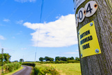 Sign on a wooden telephone pole warning people that the pole is carrying fibre optic cable.