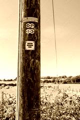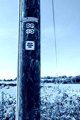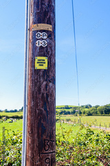 Sign on a wooden telephone pole warning people that the pole is carrying fibre optic cable.