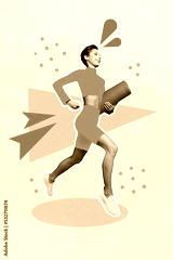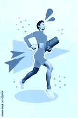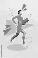 Vertical collage image of sporty excited girl black white colors running hold fit mat isolated on creative background