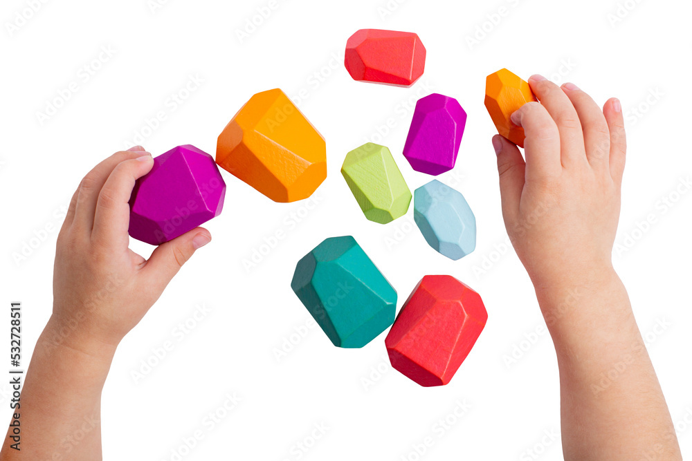 Wooden colorful toy blocks isolated in kid hands , rainbow color. Baby development. Design element pastel