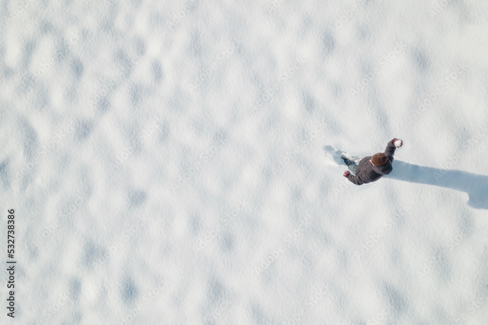 Man playing snowballs on the snow in a park. Winter. Drone, top, aerial view.