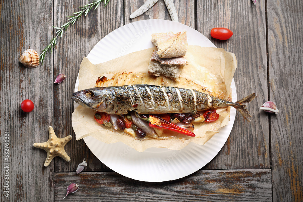 Whole, baked mackerel, served with vegetables and bread, on a plate, top view. Roasted fish on a parchment paper.