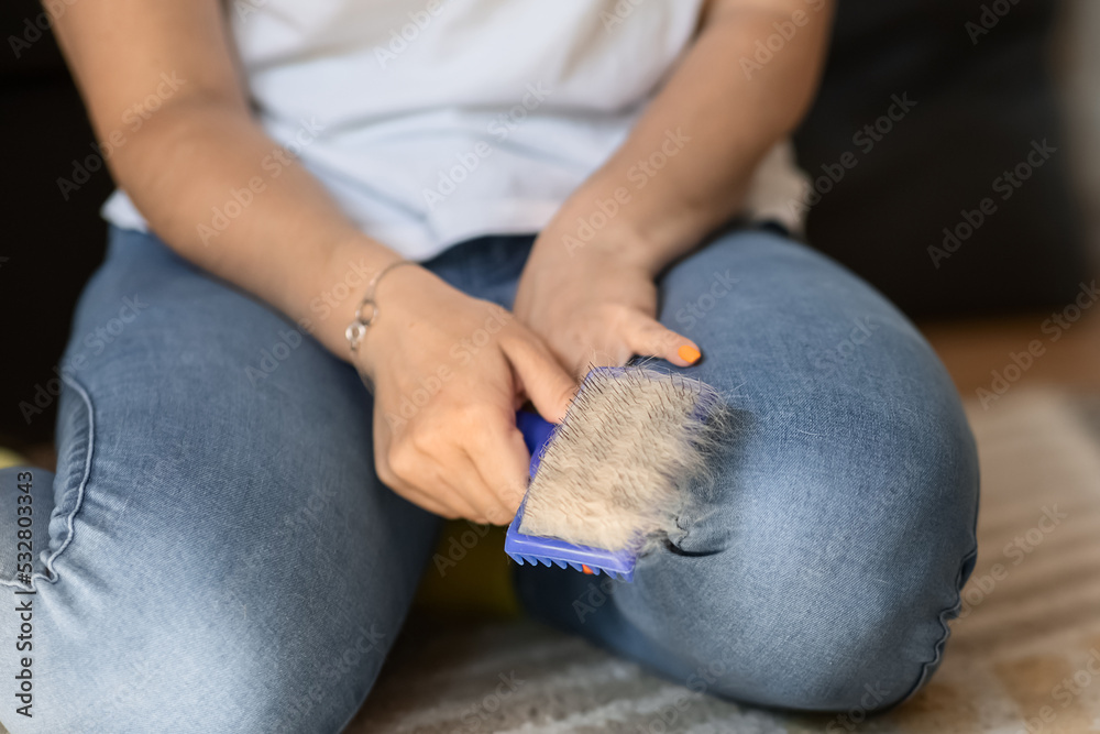 a young faceless woman, the owner of a dog, holds a comb with wool in her hands, sitting on the floor in an apartment. the concept of daily pet care