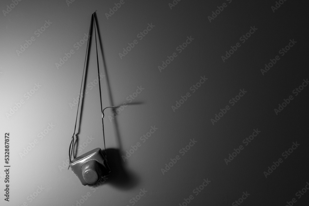 An old film camera hanging on a wall. Black and white. Retro style. copy space