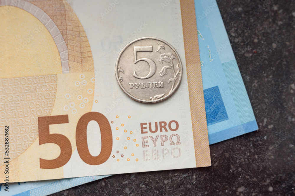 Exchange of russian rubles. Five rubles and fifty euros. Close up