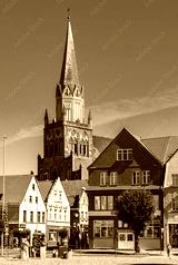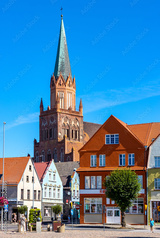 Panorama of Rynek main market square with Holy Mary gothic church in old town quarter of Trzebiatow in Poland