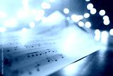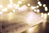 Old sheet with Christmas music notes as background against blurred lights. Christmas music concept