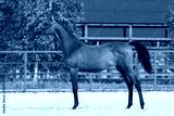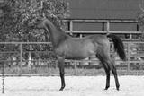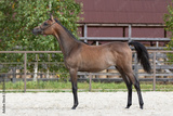 Chestnut arabian horse stands on natural green summer background, profile side view, exterior