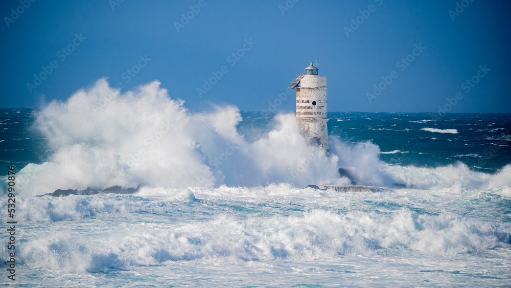 The lighthouse of the Mangiabarche shrouded by the waves of a mistral wind storm