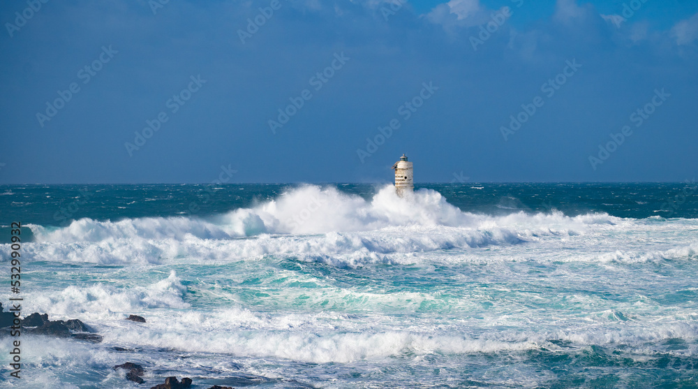 The lighthouse of the Mangiabarche shrouded by the waves of a mistral wind storm
