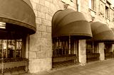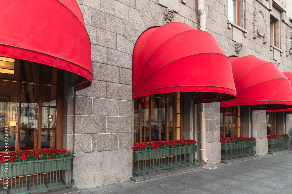 Red awnings over the windows of the hotel. Exterior window canopies outside the building.