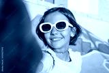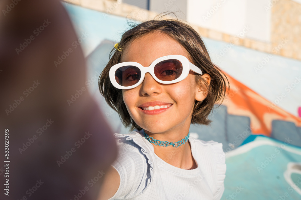 Brunette happy girl wearing sunglasses smiling toothy while making selfie outdoors