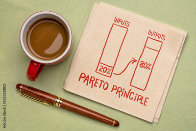 Pareto 80-20 principle concept - a sketch on a napkin with a cup of coffee, priorities and productivity concept