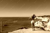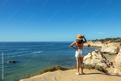 Young girl in a straw hat watching the beauty of the Algarve beaches, Portugal