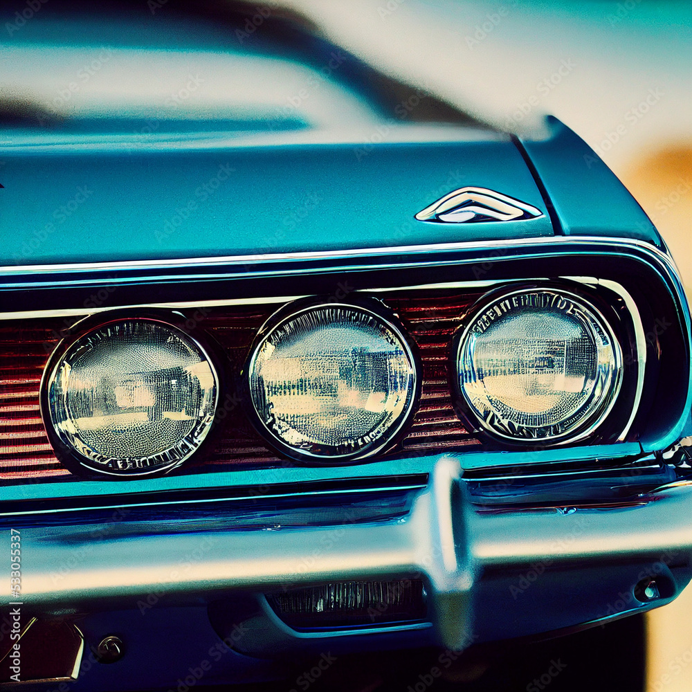 Old american fantasy muscle car with three headlights