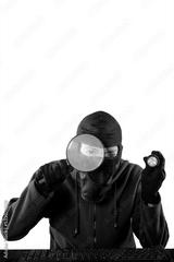 Hacker hold magnifier and flashlight to steal data