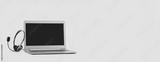 Front view of slim laptop with headset on beige. Monochrome background. Distant learning. working from home, online courses or support. Audio podcast headphones . Helpdesk or call center banner