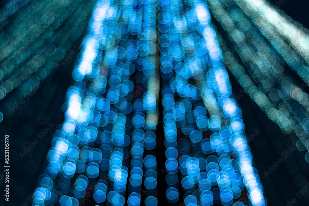 Festive blue xmas lights on christmas tree in urban central park at holiday evening in winter night, defocus shiny garland decoration glow in bright bokeh in dark downtown, blur image