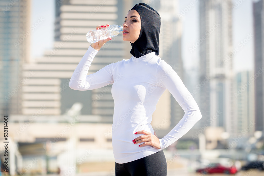 Arabian woman with typical muslim dress training outdoors in Dubai - Middle-eastern beautiful female adult doing fitness outside