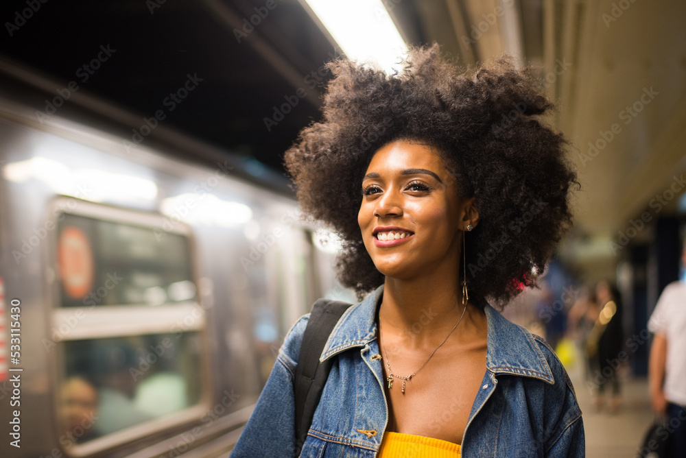 Beautiful afro-american woman walking in New York - Young black female adult tourist in Manhattan, USA