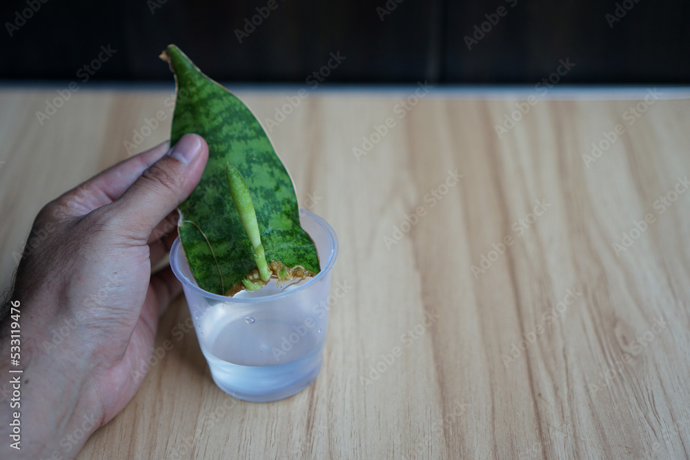 Propagation of Sansevieria plants by cutting the mature leaves and then soaking them in water in a glass. Sansevieria shoots and roots.