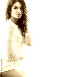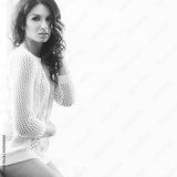 Black and white photo of young and beautiful brunette woman posing near the windowsill. Daylight from the window.