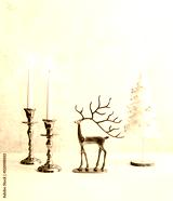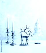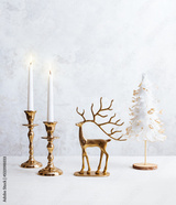 Cozy still life with burning candles, figure of deer and christmas tree on pastel light background. Christmas composition decoration of home.