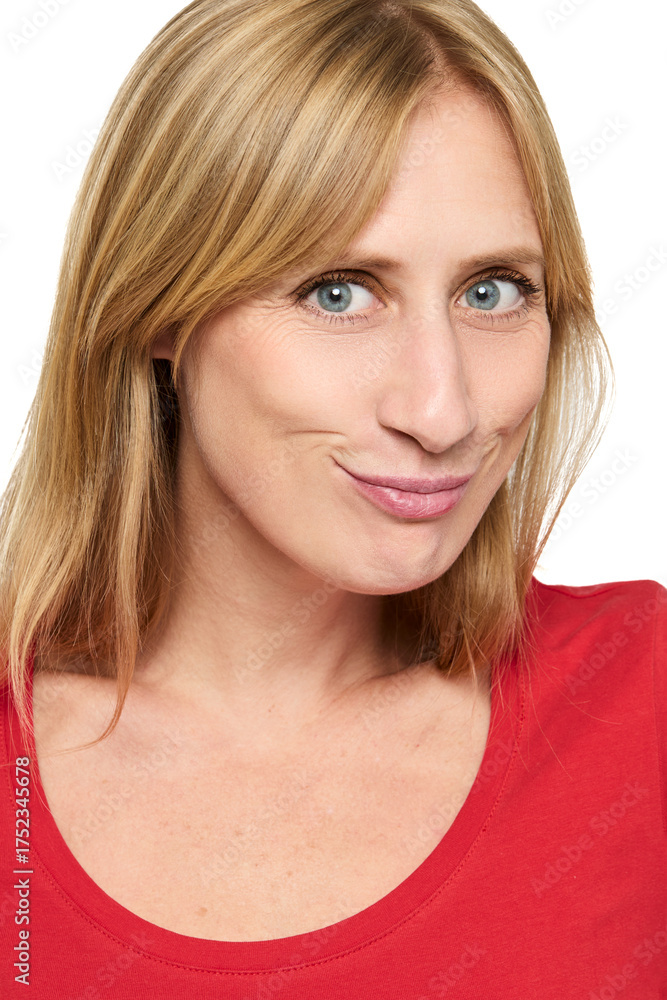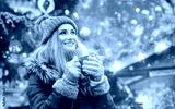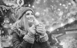 Woman in front of Christmas tree on winter market drinking hot wine looking at camera