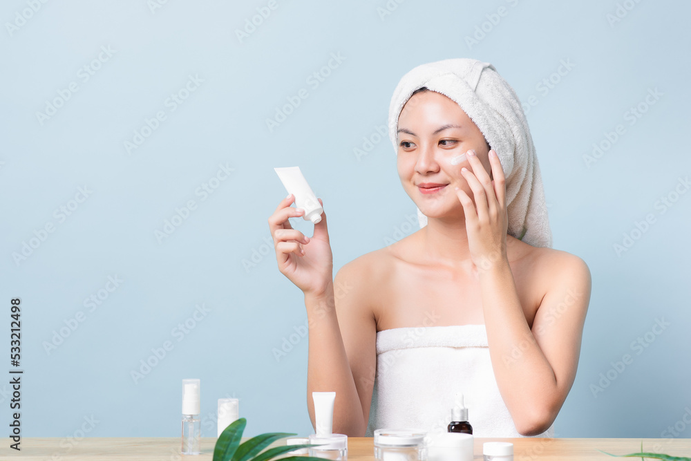Beautiful Asian young woman smiling while applying white cream on her face with many packaging of facial cream and cosmetics on wooden table with copy space light blue pastel background.