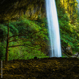 Abstract geometry of waterfalls, dead trees, and volcanic rock cave ceilings at North Falls in the Silver Falls State Park near Salem, Marion County, Oregon