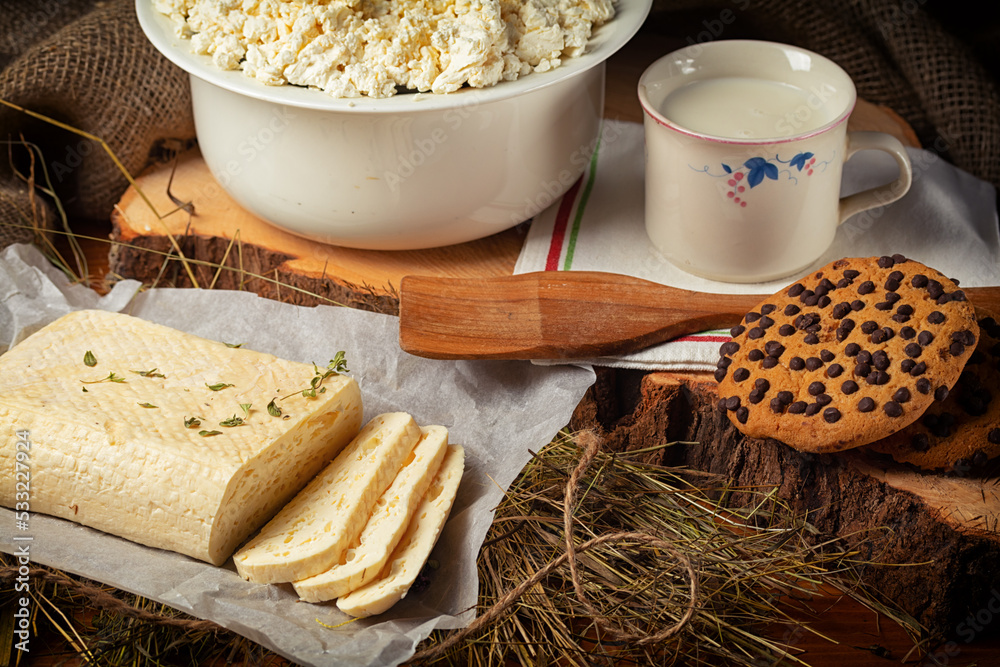 homemade wheel of cheese ang pitcher of milk on wooden table.