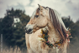 Horses in autumn: Portrait of a beautiful norwegian fjord horse mare wearing an autumnal flower wreath around her neck