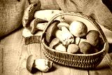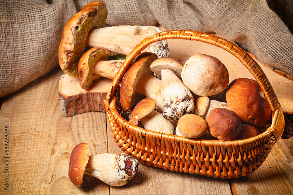 fresh picked porcini mushrooms, Boletus mushroom, ceps on wooden table.