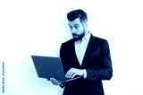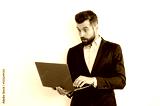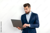 Shocked surprised caucasian bearded business man, in a suit, programmer, IT specialist, holding opening laptop in hands, looks in amazement at the screen, standing on isolated white background
