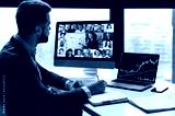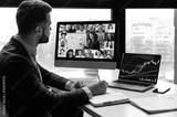 Online video lesson on investments. Motivated successful stock investor, trader, listens to an online webinar on the topic of trading, investment. Group of multiracial people on computer screen