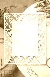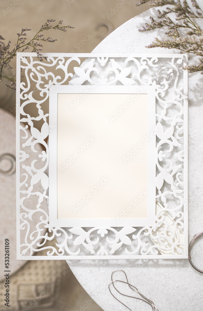 mockup vintage blank photo frame on stone table with sunlight
