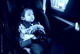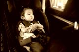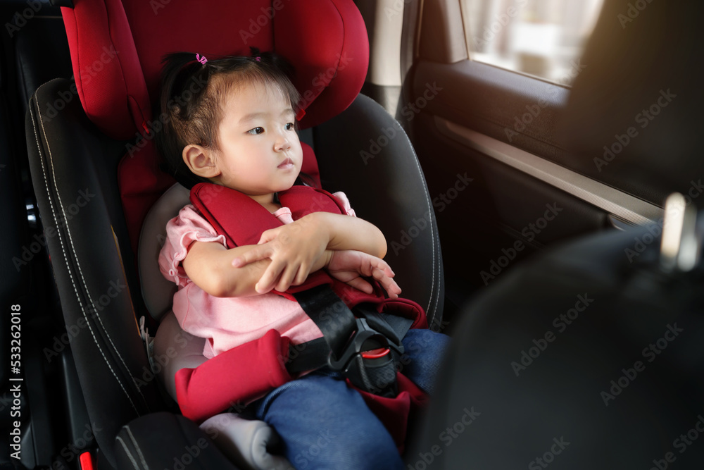 toddler girl sitting with arm crossed in car seat and looking out of the window