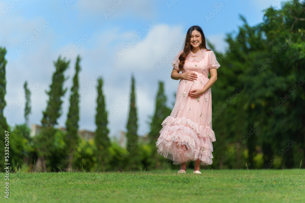 cheerful pregnant woman standing in park
