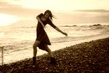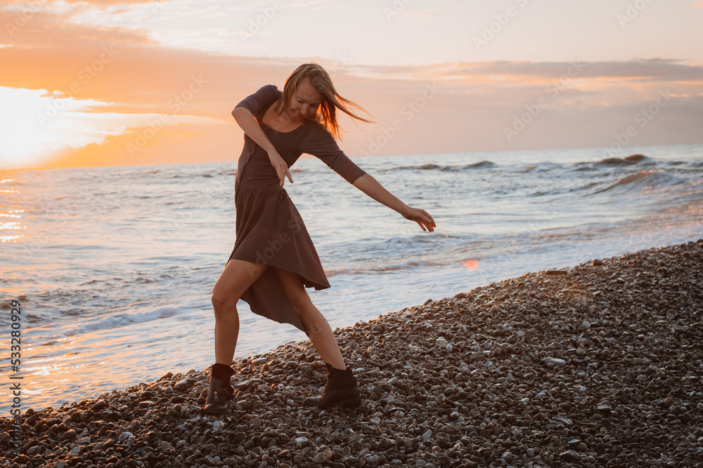 woman dances on the seashore at sunset. Psychology of soul and body dance grace