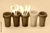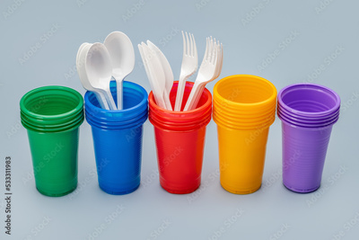 A set, in a row, of multi-colored disposable cups for drinks and cutlery. Grey background.