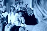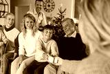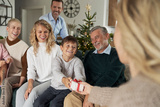 Caucasian boy giving Christmas present to his mom and family sitting around