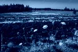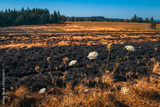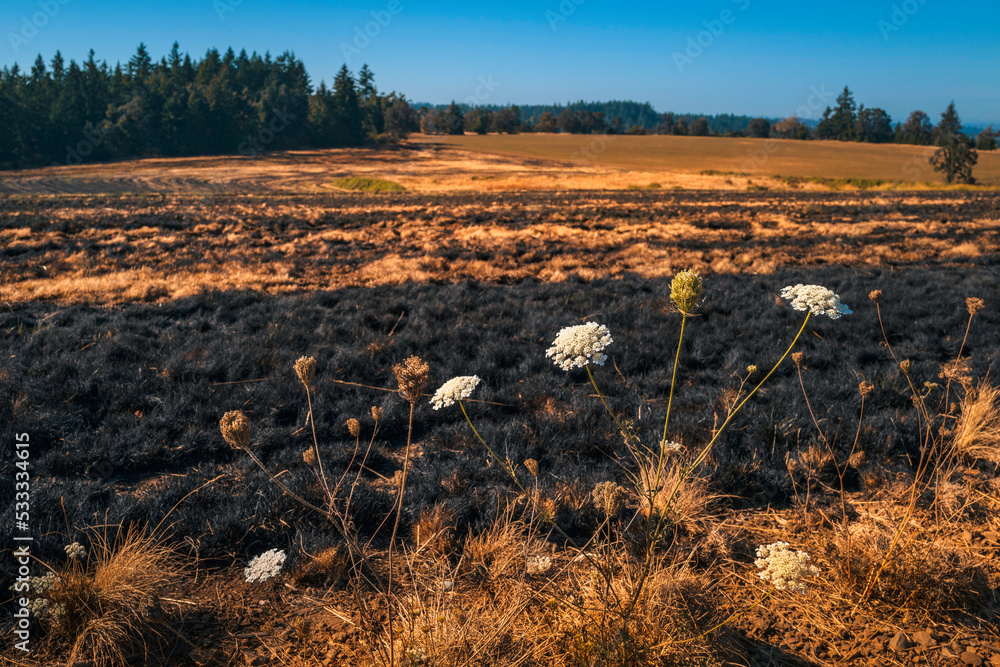 Wildflowers survived from wildfire in the burnt agricultural fields, in autumn near Silver Falls State Park in Oregon