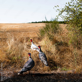 Three turkeys with one albino turkey in the agricultural field in Silverton, Oregon, near Silver Falls State Park.
